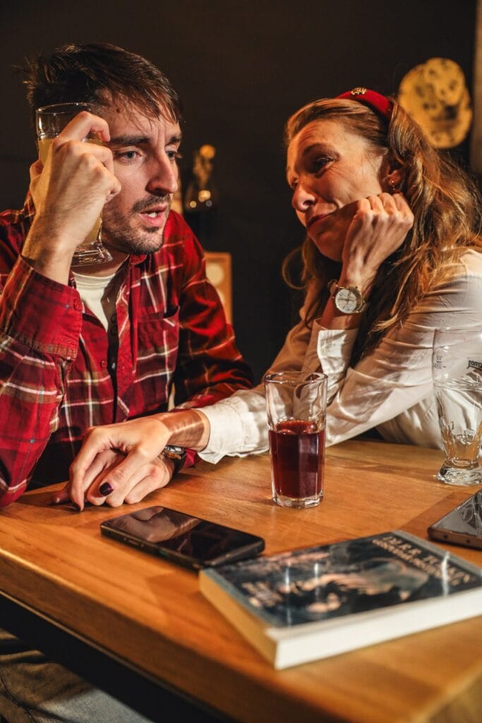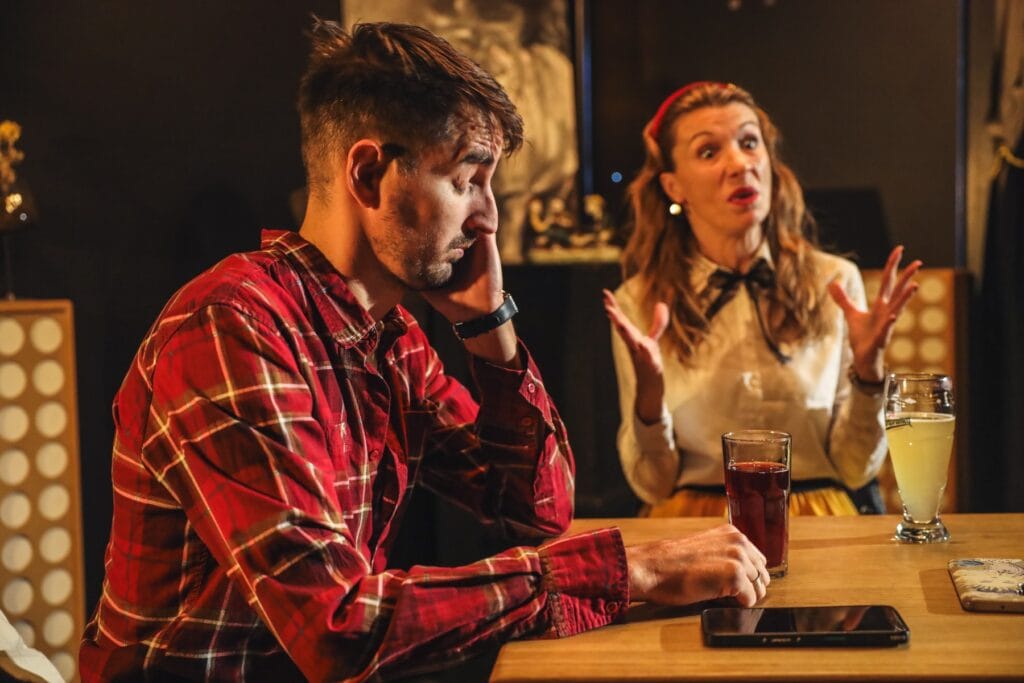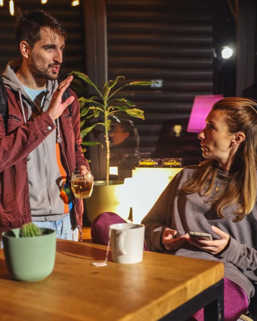 Epizode prate razvoj odnosa bračnog para na terapiji svakog utorka u isto vreme. Pre sesije, Mihajlo i Olja se sastaju u kafiću, gde neformalni razgovori često prerastu u otvaranje tema namenjenih terapiji. Publika prati njihov put kroz univerzalne teme – briga o ljubimcu, roditeljstvo, odgovornost, karijeru, finansije, ljubomoru i svakodnevni suživot. U tih 45 minuta pre terapije, oni pokušavaju da se pomire, ali ih njihove unutrašnje promene često udaljavaju od cilja. Postajući tihi posmatrač u kafiću, publika prisluškuje njihove najintimnije razgovore. Režija se oslanja na minimalizam, fokus i intimnost, ističući svakodnevne tenzije i emotivna previranja. Predstava, naizmenično dramatična, cinična i komična, verno oslikava savremeni život i odnose, u kojima će se mnogi prepoznati.